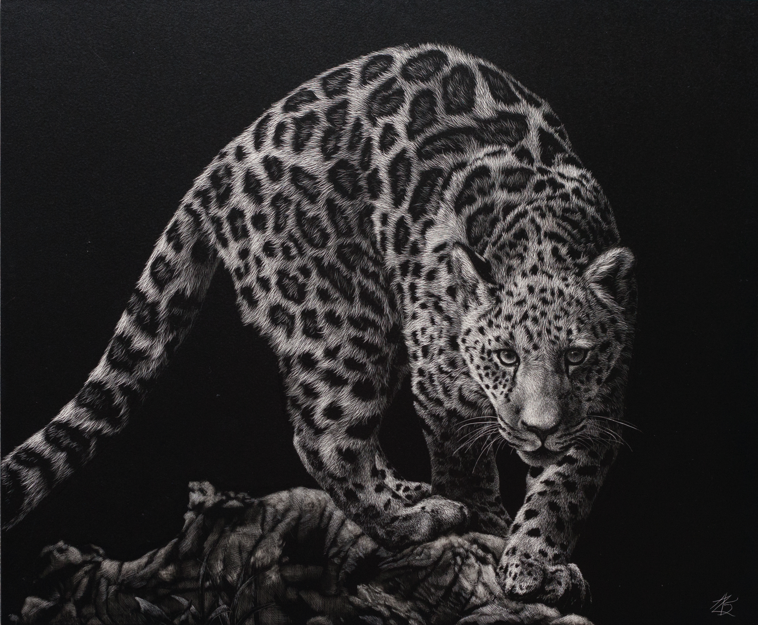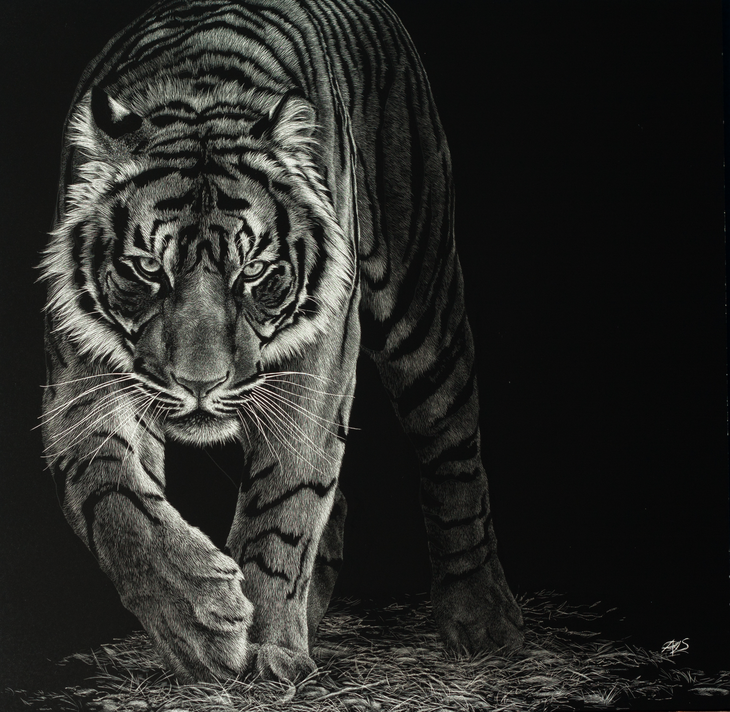 This is been a very busy spring for me, with a lot going on that made me feel like I couldn’t be very busy in the studio. And then I had to give up on my last scratchboard, which was supposed to be a pair of swans. I hate to let go of a project and set it to the side, but sometimes it’s for the best. Most artists have a stack of “rejects” sitting in the corner somewhere and I had to add that one to mine. But life has finally settled down a little bit and I’ve been able to focus on getting to work. The happy result is that I have this tiger newly finished. This one was a lot of fun from start to completion and I love how he just stalks into the light.